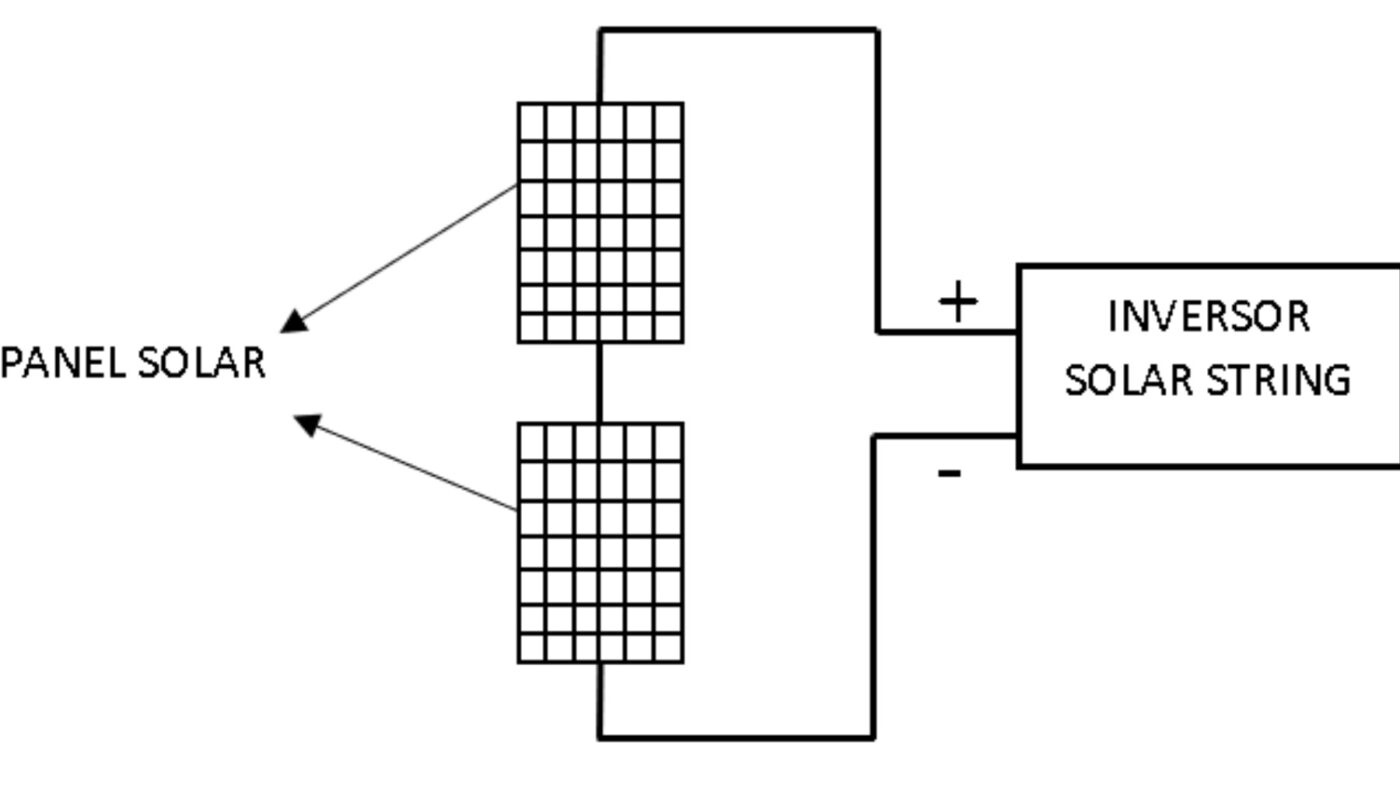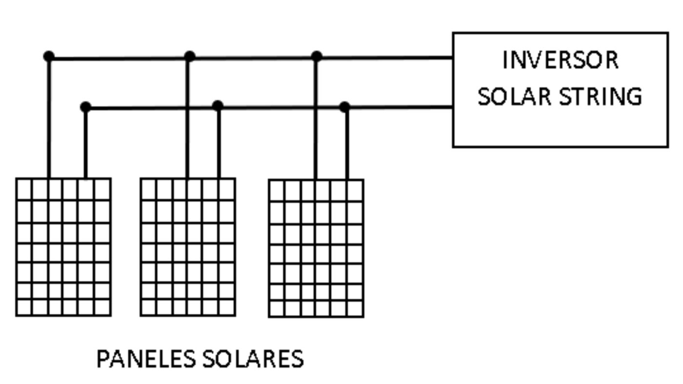 Esta es la configuración más utilizada en instalaciones residenciales y comerciales de baja potencia. En la misma, los inversores están diseñados con una entrada en DC, puesto que los paneles solares son conectados en serie, formando una cadena o string tal y como se muestra en el diagrama a continuación. Esta configuración se detalla en este artículo.