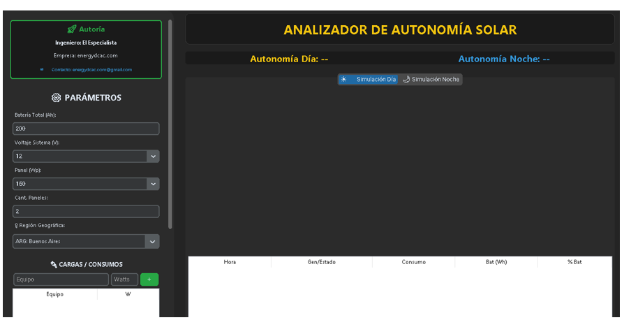 Bienvenido a Solar Analyzer Pro software Analizador de Autonomía Solar, la herramienta definitiva desarrollada por energydcac (y que encuentras en su Tienda) para el análisis del comportamiento y estimación de autonomía en sistemas de energía solar. Este software ha sido creado para facilitar el cálculo de eficiencia y el monitoreo de parámetros críticos en tiempo real. Es ideal para ser combinado con el software Diseñador de Sistemas de Energía Solar que puedes adquirir en energydcac..