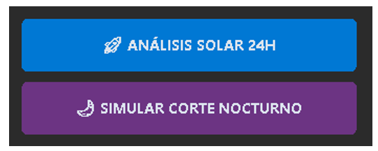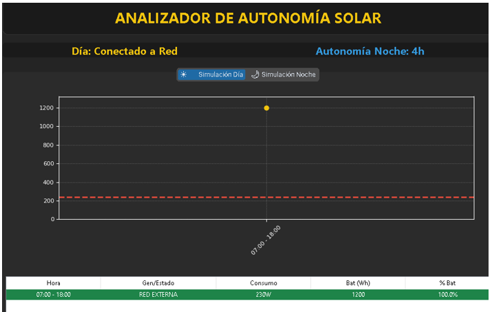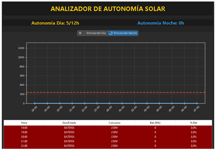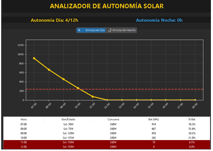 Este análisis corresponde a cuando, durante las horas de sol, no ocurren cortes de servicio por lo que la batería llega a la noche con una carga del 100 %. Esta opción te dice las horas de autonomía que tendrás durante el periodo nocturno. Es por ello que, en los contadores de horas de autonomía, solo se especifica la de noche. Si escoges la SIMULACIÓN DE DÍA te presentará algo así: