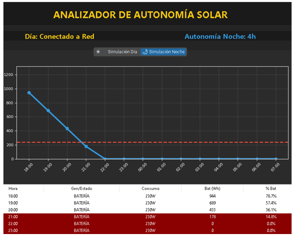 Aunque por defecto llega a la primera. En esta opción, el sistema depende de la electricidad que suministren los paneles solares y las baterías. Da como resultado inicial la curva y tabla de descarga y autonomía durante el día, es decir, durante las horas de sol donde se especifica el tiempo estimado de respaldo que tendrás por baterías y por los paneles solares. A continuación, se muestra un ejemplo donde da como respaldo todo el día y otro que lo brinda solo por algunas horas.
