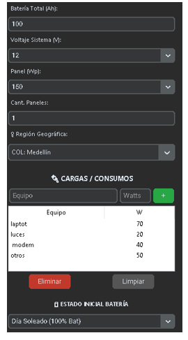 • Cargas/Consumos: Aquí puedes especificar el nombre de cada carga y su consumo en W. Cuando lo hayas hecho, haces clic en el botón “+” para añadir esta carga al sistema, pero si quieres eliminar alguna, la seleccionas y presionas el botón ELIMINAR que aparece en la parte inferior del cuadro. También puedes borrar todas las cargas haciendo clic en el botón LIMPIAR.